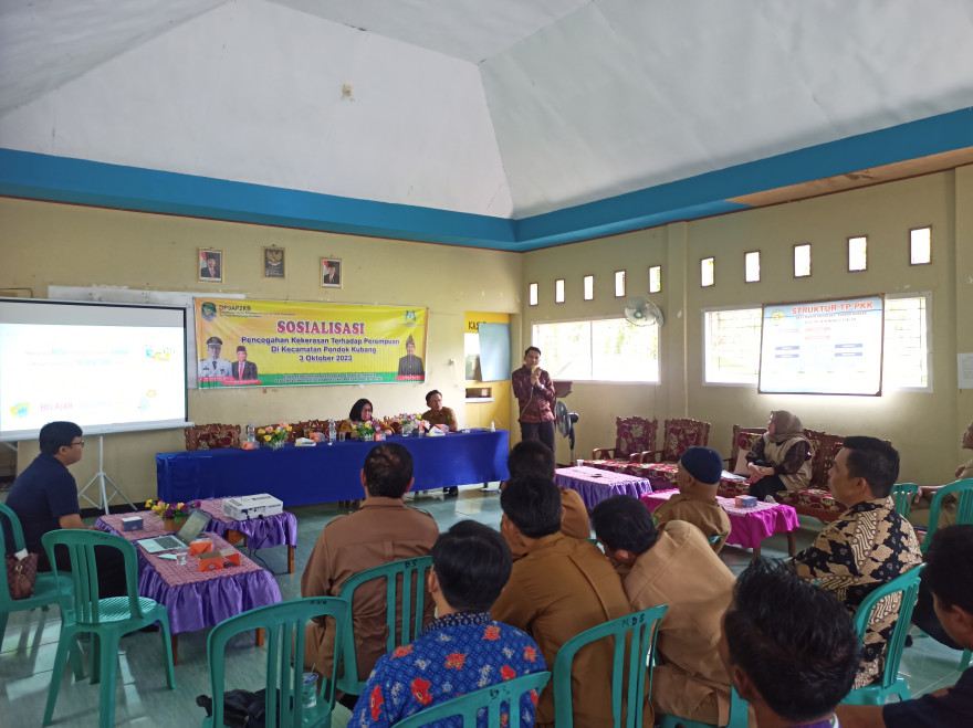 Sosialisasi Kekerasan terhadap perempuan sekecamatan pondok kubang yang dilaksanakan di aula sasana mangun karsa desa margo mulyo kecamatan pondok kubang kabupaten bengkulu tengah (03/10/2023) yang dihadiri kepala desa di kecamatan pondok kubang, kegiatan ini diselenggarakan oleh dinas pemberdayaan perempuan perlinndungan anak pengendalian pennduduk dan keluarga berencana (DP3AP2KB), dengan narasumber yaitu: ibu Ainun Mardiati, S.psi. M.H. Jabatan: Kepala UPTD PPA Provensi Bengkulu Ketua Asosiasi Psikologi Forensik Wilayah Bengkulu. Narasumber kedua yaitu: Bpk Wendry Surya Pratama M.psi. ikatan pisikolog klinis ipk Indonesia wilayah Bengkulu. Dengan materi yang di bahas mengenai kekerasan terhadap perempuan dan tindak pidana yang ada, dan membahas bagaimana cara agar kekerasan terhadap perempuan dan anak tidak terjadi dan membahas bagaimana cara penyelesaian apabila terjadi masalah kekerasan terhadap perempuan dan anak yang ada tengah masyarakat.